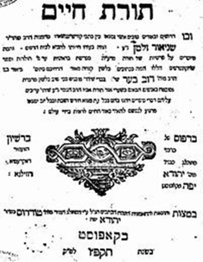 Дов Бер із Любавичів (Мітелер ребе, 1773–1827). Другий Любавицький ребе, цадик руху Хабад. На фото перше видання його твору «Торат Хаїм», 1826